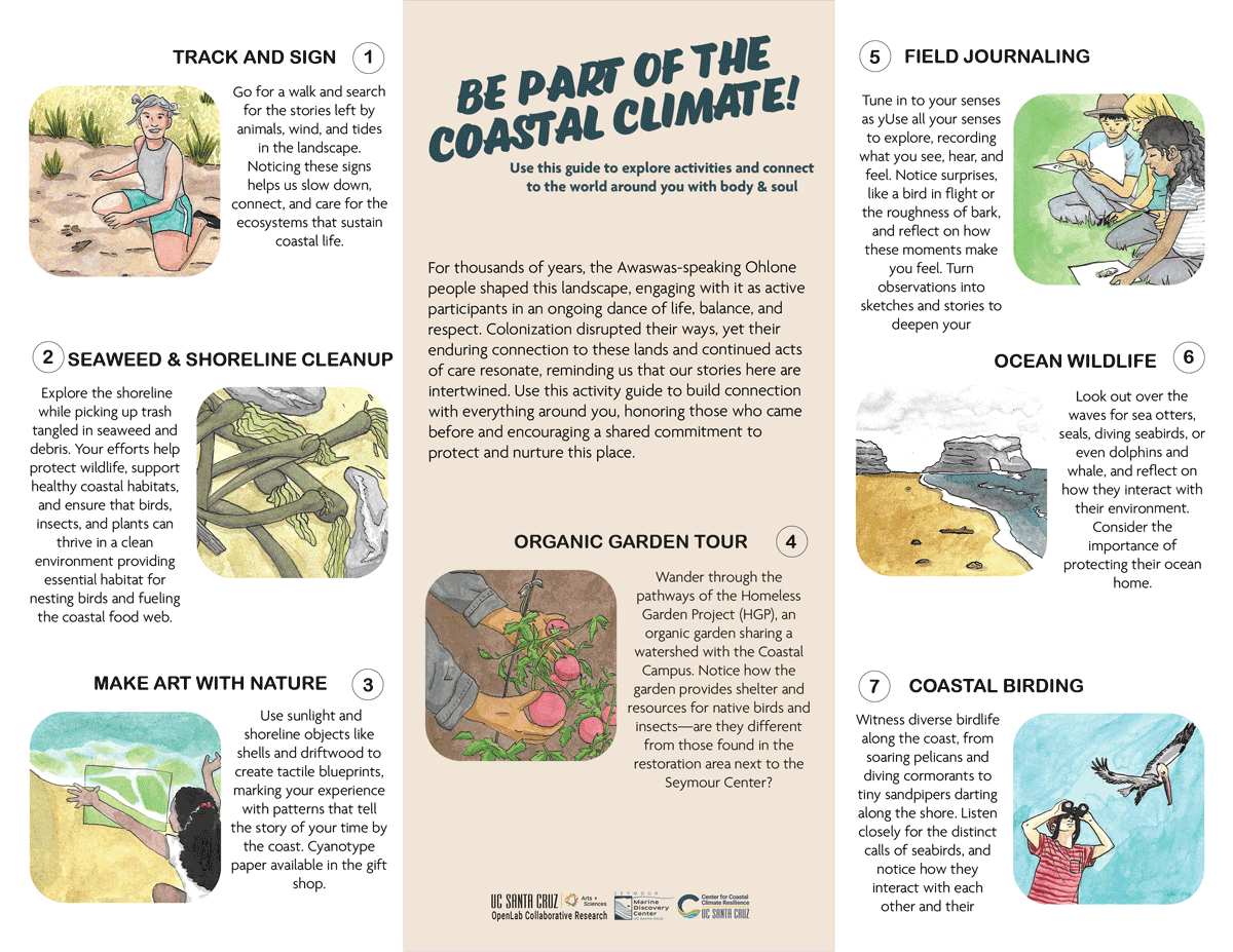 The project combines environmental science, design, and participatory art to translate coastal research into accessible experiences for broad audiences. Methodologically, the guide functions as both a field-based teaching tool and a model for place-based outreach. Activities such as field journaling, shoreline cleanup, ecological art-making, and coastal birding encourage participants to engage in scientific observation, environmental stewardship, and creative interpretation.