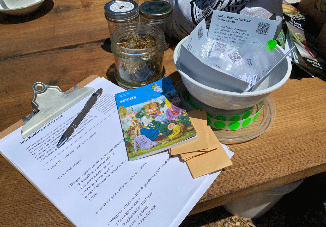 The Satellite Seed Saver garden project aims to direct the visitors’ gaze up towards the heavens and down towards the soil – connecting plants in the garden to multi-species activities in the sky and reflecting on environmental stewardship in outer space and here on Earth. As part of the project, we exchanged seeds at the Greenhouse Seed Exchange and grew plants at UC Santa Cruz, cultivating living examples of the connections between local biodiversity and cosmic imagination. The project marks the beginning of a broader research initiative, Space Permaculture, which examines the motivations and ideologies that drive collective action in Space Exploration & Terrestrial Agroecology.